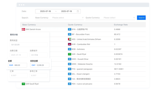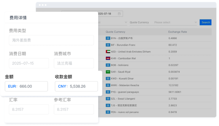 系统可依据费用发生城市,自动识别对应消费币种,并基于实时汇率完成外币与本币的精准换算,无需人工干预,减少换算误差