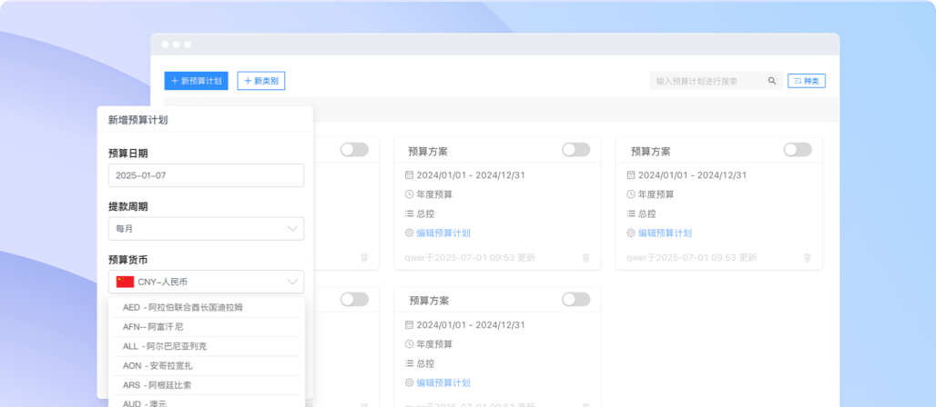 支持企业针对不同地区(如欧元区、东南亚区域)、不同项目维度,自定义配置专属预算币种(如欧元区适配欧元、东南亚适配美元),精准匹配全球化经营场景下的差异化预算管理需求