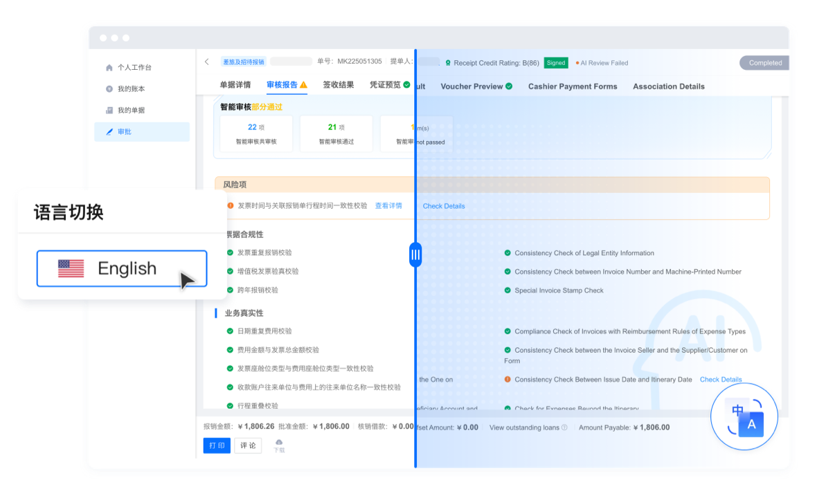多语种支持无需额外设置,切换目标语言后,系统菜单、操作指引及票据解析均同步适配。用户可顺畅完成报销提交、审批等全环节,消除跨国合作语言障碍,契合不同地区文化的语言偏好,提供贴心个性化服务